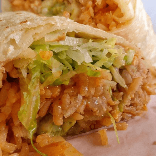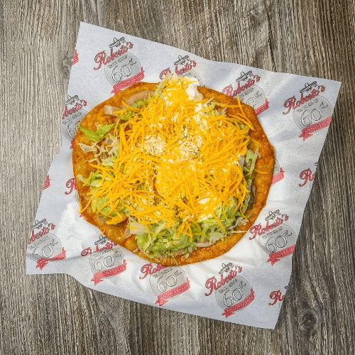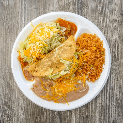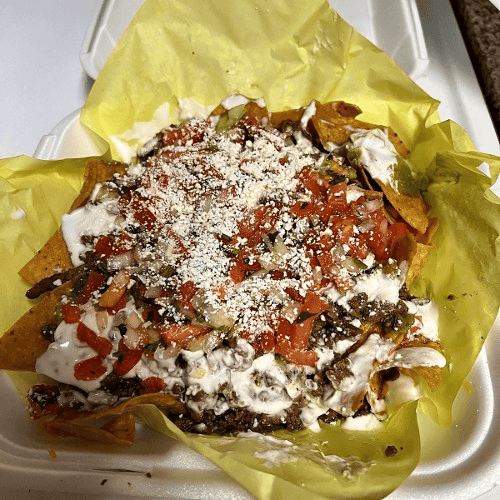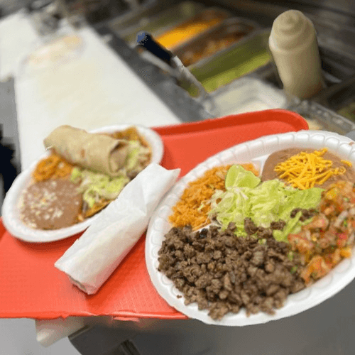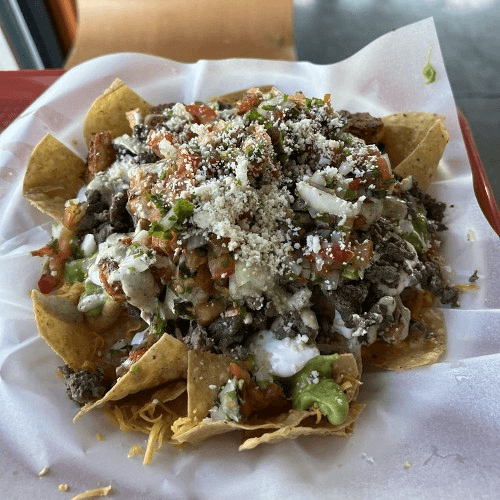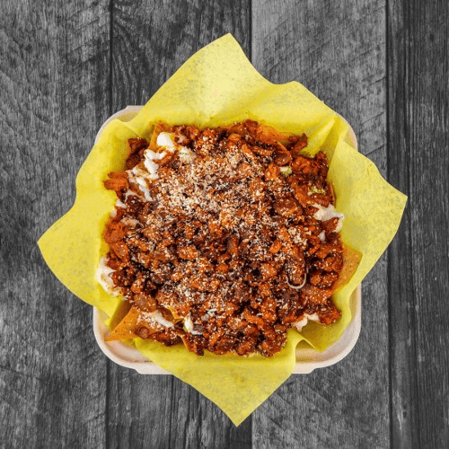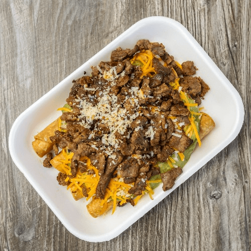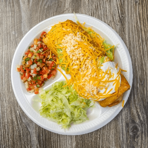 Shredded beef (cooked with bell pepper, onion, and tomato), with beans and cheese inside. Topped with guacamole, sour cream, Cheddar cheese, and enchilado cheese. Garnished with lettuce and salsa Mexicana