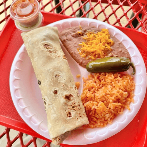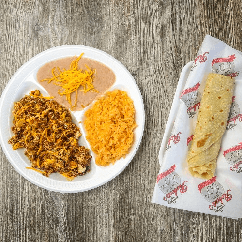 Shredded beef & eggs served with rice & beans, choice of tortillas