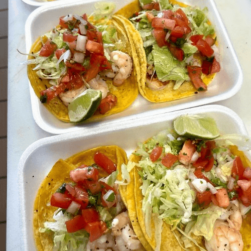 Grilled shrimp, baja sauce, salsa fresca, cabbage, lime