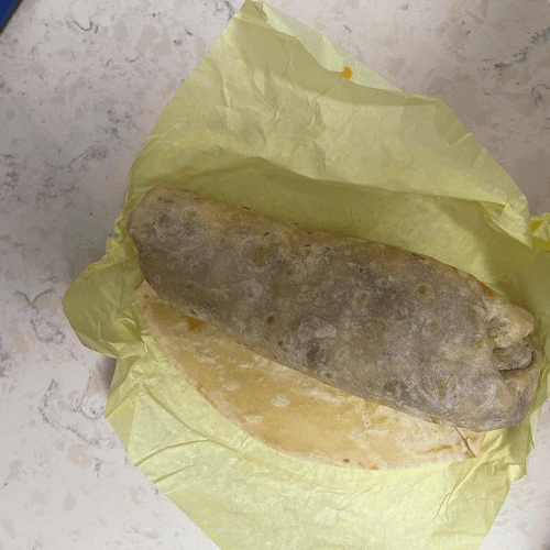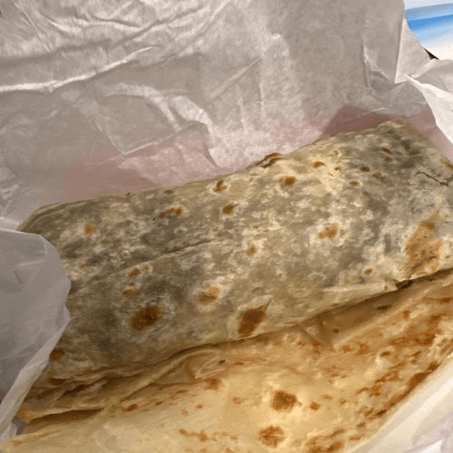 Carne asada with beans and cheese inside. Topped with guacamole, sour cream, Cheddar cheese, and enchilado cheese. Garnished with lettuce and salsa Mexicana