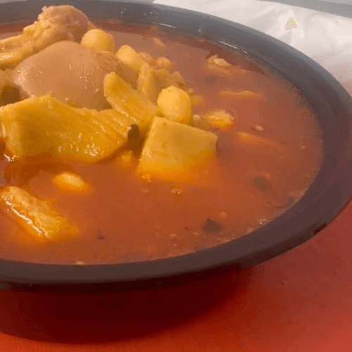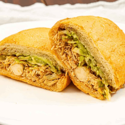 Chicken (cooked with bell pepper, onion, and tomato), with beans and cheese inside. Topped with guacamole, sour cream, Cheddar cheese, and enchilado cheese. Garnished with lettuce and salsa Mexicana